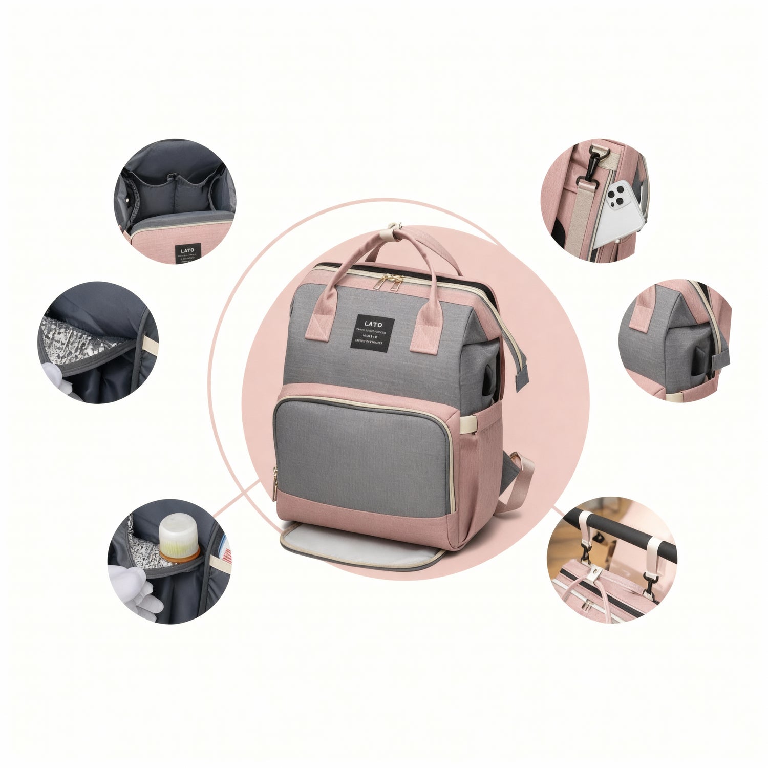 This diaper bag features a roomy 25L interior with multiple compartments for diapers, bottles, wipes, clothes, and mom’s essentials. It includes a fold out changing station with a breathable padded mat, insulated bottle pockets, a waterproof wet/dry pocket, easy access side pockets, and an anti theft back pocket. Extra accessories like a sunshade cover, toy arch, USB port, and stroller straps make it practical for daily use and travel.